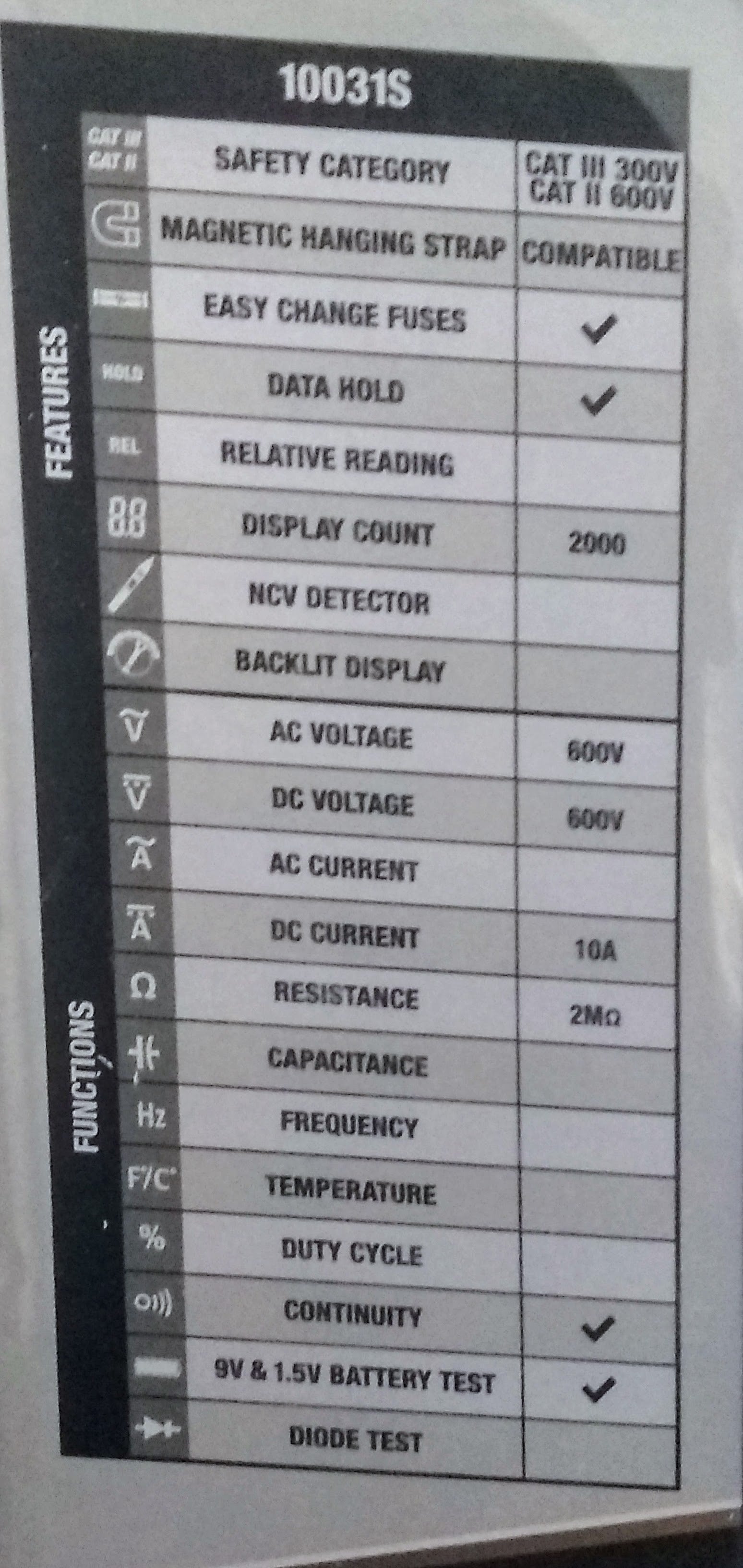 7 Functions include AC/DC voltage, DC current, resistance, continuity, 1.5V and 9V battery test